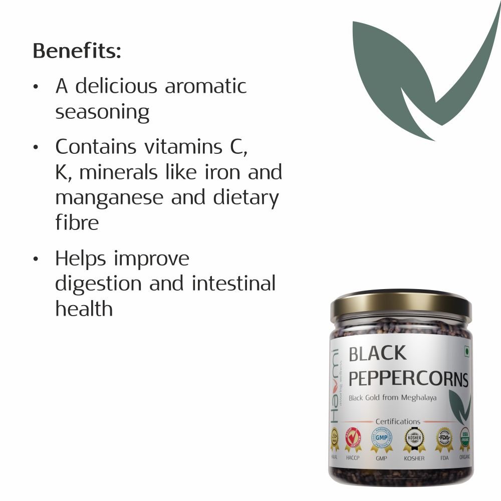 These black peppercorns are handpicked at the right maturity and optimally processed to preserve all the goodness and aroma. Our black peppercorns, packed in eco-friendly, aroma lock, re-sealable packs ensure you receive the product as fresh an aroma-rich. Havmi's peppercorns are preservative-free.