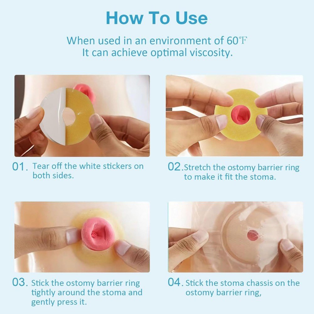 Medifeliz Seal barrier rings can be used to fill in or caulk uneven skin contours near the stoma to create a flatter surface and help prevent ostomy drainage from getting under the ostomy barrier. They may be cut, stretched, or stacked together to help improve the fit of a pouching system.