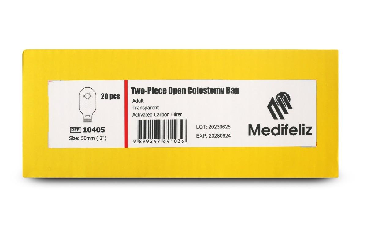 Medifeliz 10405 Two-Piece Colostomy Bag features a 50mm flange system with a separate opaque pouch, allowing easy pouch replacement without removing the skin barrier. Designed for comfort, discretion, and secure attachment, this pack of 10 is ideal for daily and long-term colostomy care.
