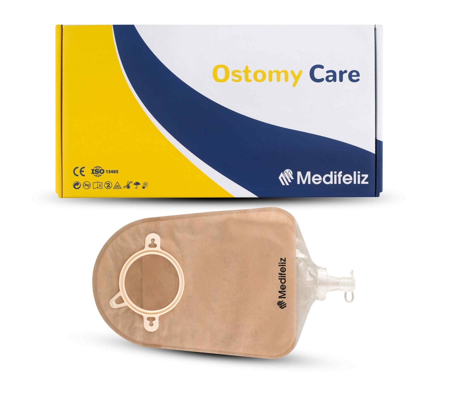 Medifeliz 10706 Two-Piece Urostomy Bag features a 60mm flange system with a separate opaque urostomy pouch, allowing pouch changes without removing the skin barrier. Equipped with an anti-reflux valve, it ensures hygienic urine drainage, comfort, and reliable adhesion for daily urostomy care.